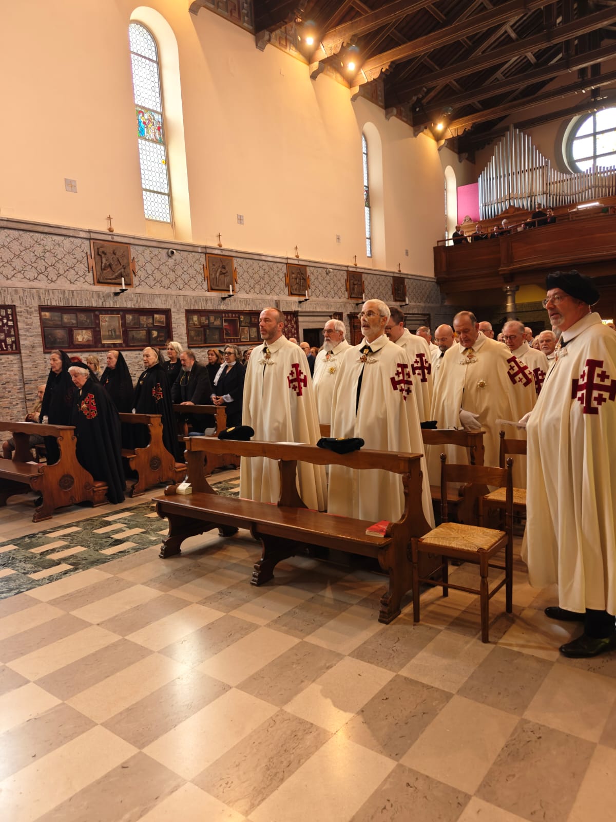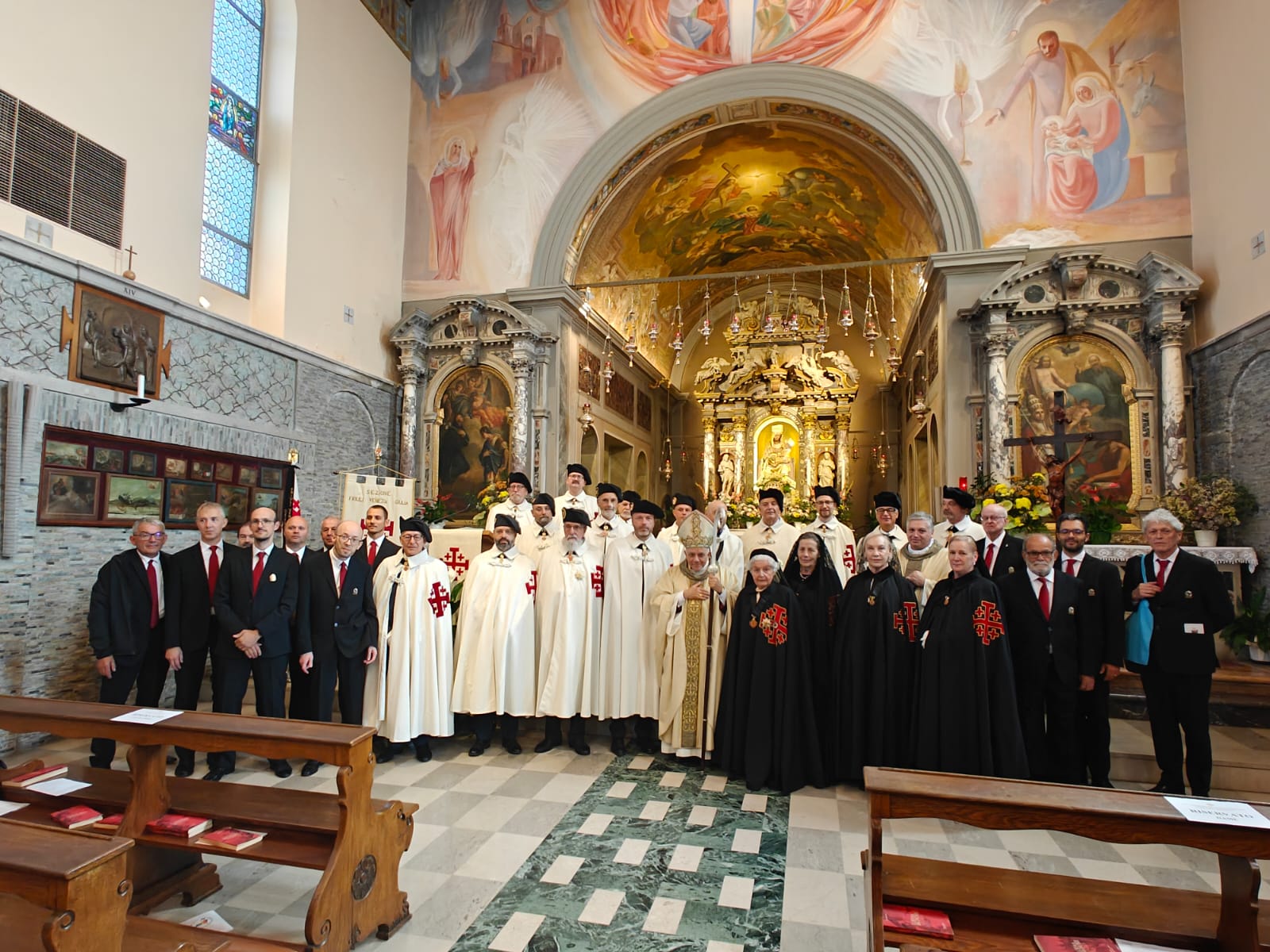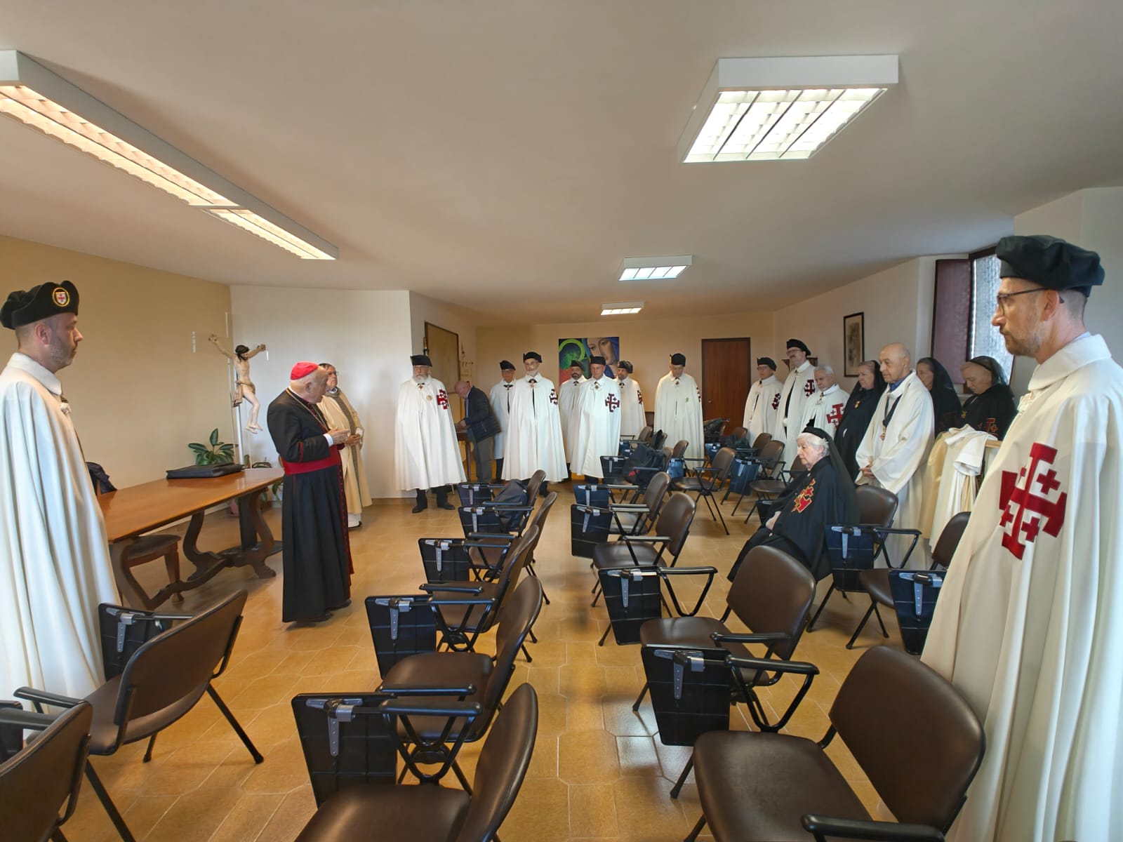 Al termine della celebrazione i partecipanti si sono posti alla base del presbiterio per invocare la Vergine Maria, rivolti verso la statua della Madonna col Bambino, affinché interceda per essere aiuto e sostegno al Gran Priore dell’Ordine – Sua Beatitudine il Patriarca Pierbattista Pizzaballa – in questi momenti così difficoltosi e delicati e perché possano quanto prima spegnersi l’odio e la violenza, affinché possano essere curate le anime sofferenti delle genti che stanno patendo l’orribile barbarie della guerra e illuminate le menti di chi governa così da far cessare ogni orribile barbarie.