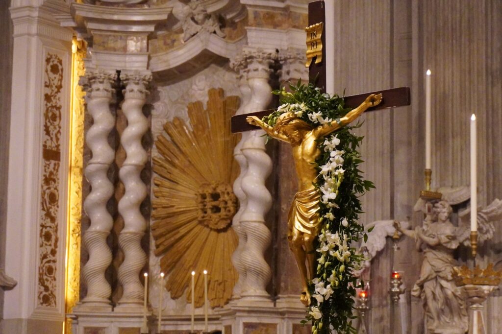 Eccola, la campana. Dalla sagrestia la processione di casule bianche è preceduta dalla grande croce nera fiorita, con il crocifisso dorato, che ha accompagnato il Giubileo nella Cattedrale udinese.