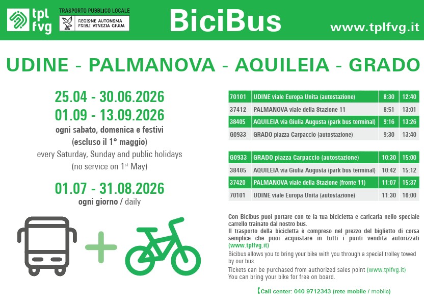 Dal 25 aprile è ripartito il servizio BiciBus di Tpl Fvg sulla tratta Udine – Palmanova – Aquileia – Grado: un modo pratico per muoversi lungo la Ciclovia Alpe Adria e tra città d’arte, borghi storici e mare, con bici al seguito.