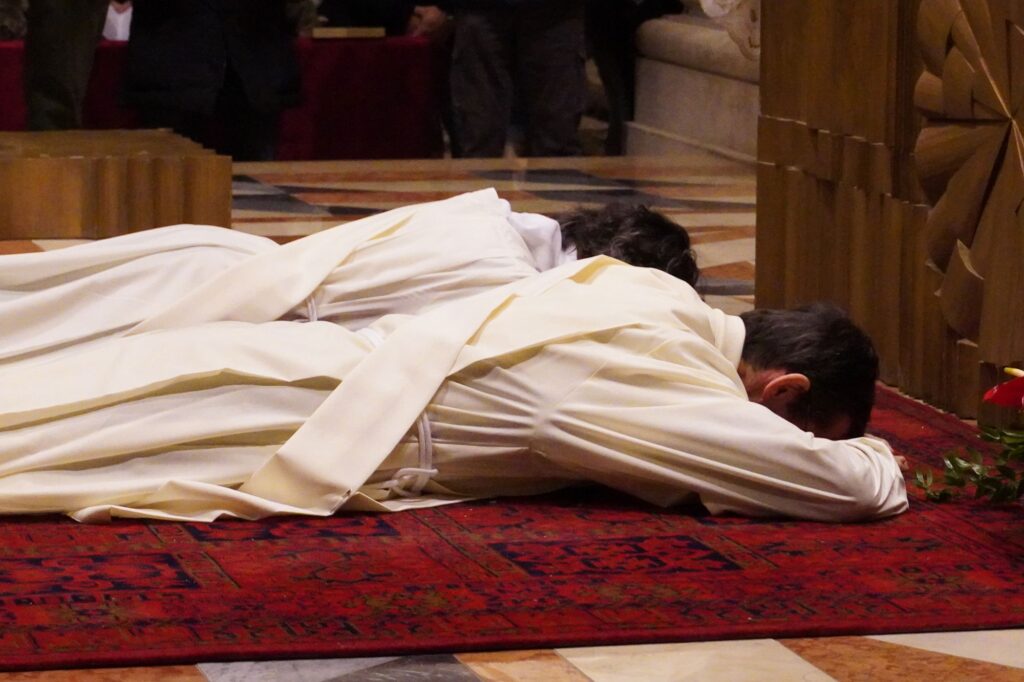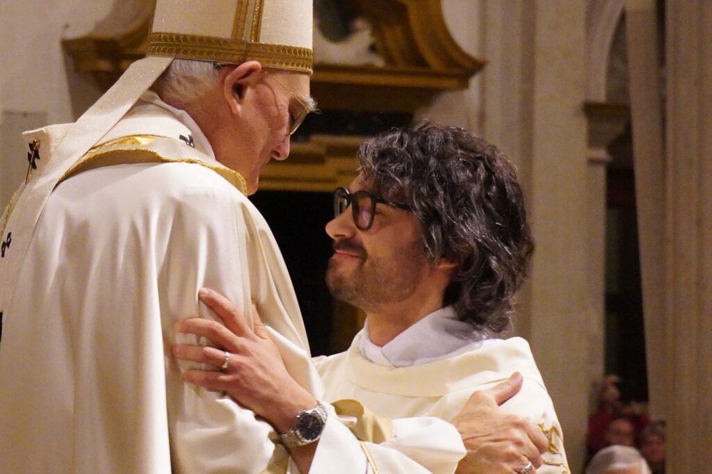 La ricchezza del rito accompagna la commozione di chi sa di trovarsi davanti a due persone che hanno scelto di donare l’intera vita al Signore: la prostrazione distesi a terra, il canto delle litanie dei santi, l’imposizione delle mani dei preti presenti sul capo dei loro nuovi confratelli, così come l’unzione di quelle dei due novelli preti da parte dell’Arcivescovo, la vestizione con gli abiti sacerdotali: via la dalmatica e la stola “in diagonale” per abbracciare la casula e la stola diritta, alla maniera sacerdotale. E quell’abbraccio, ormai fraterno, con il Vescovo e i sacerdoti presenti. In quella fredda domenica pomeriggio due nuovi preti hanno iniziato il loro servizio nella Chiesa udinese, iscrivendo il loro nome accanto a quello di innumerevoli confratelli che, nei secoli, hanno composto il variopinto presbiterio diocesano.