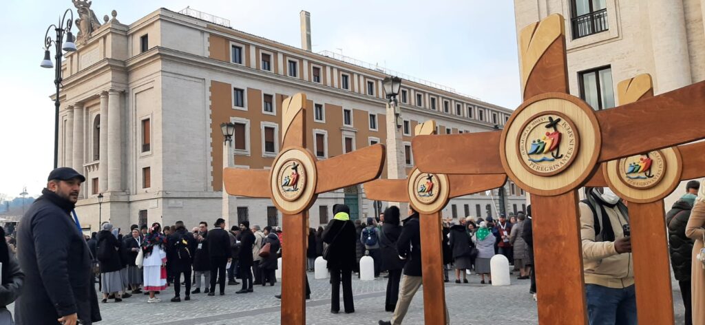 In Piazza Pia il box informativo sul Giubileo, con alcune croci per aprire il pellegrinaggio dei gruppi