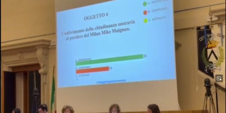 La proposta di conferire la cittadinanza onoraria a Maignan ha raccolto i 25 voti della maggioranza, mentre tutti i 13 consiglieri di opposizione hanno bocciato l’ordine del giorno: in questo modo la soglia dei tre quarti dei voti (31 preferenze) non è stata raggiunta.