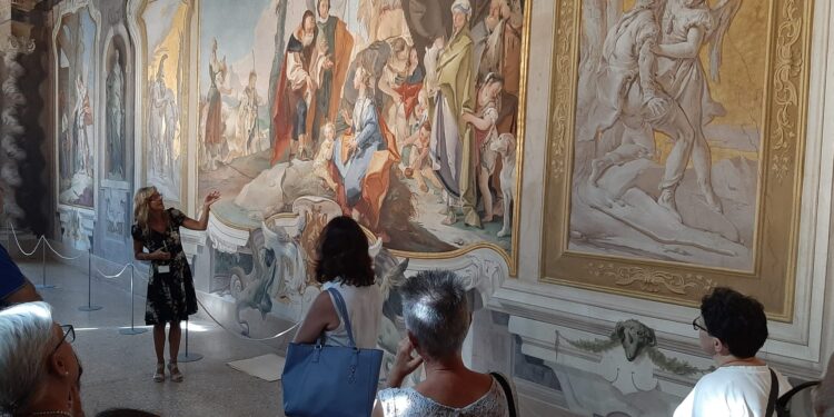 Cinque minuti, non di più, con l’Arcivescovo. Poi l’immersione nel palazzo patriarcale, con affreschi meravigliosi del Tiepolo (e non solo). Maria Rita Ricchizzi a guidare gli sguardi rivolti verso l’alto… e verso il basso: tutto qui respira storia del Friuli, persino il pavimento. «Ah guarda, non lo sapevo!» bisbiglia qualcuno commentando la guida. Piccole scoperte di un luogo che da fuori “non diresti mai”, eppure cela meraviglie tra le più belle dell’intero Friuli.