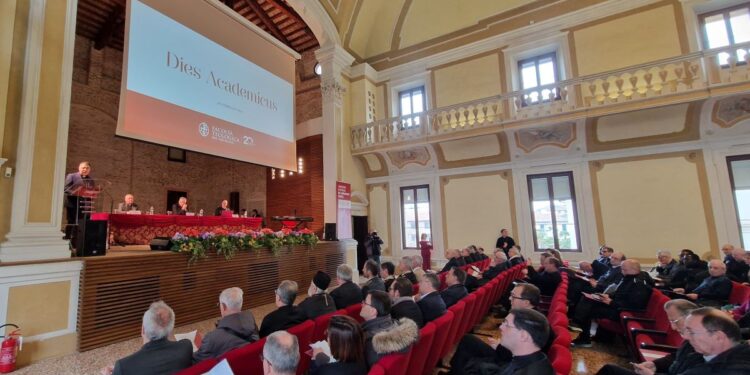 «Il 20° anniversario di fondazione della Facoltà teologica del Triveneto mi offre l’occasione per unirmi al comune rendimento di grazie al Signore per il bene compiuto in questi anni, specialmente in favore delle giovani generazioni del territorio. Incoraggio l’intera famiglia accademica a perseverare nella collaborazione alla missione della Chiesa, per diffondere il messaggio di Cristo nel mondo, fedele alla genuina tradizione, ma aperta a leggere i segni dei tempi». Papa Francesco ha inviato al preside, don Maurizio Girolami, una lettera che è stata letta durante il Dies academicus, martedì 18 febbraio 2025 a Padova. Alla Facoltà teologica del Triveneto (FTTR) è associato anche l’Istituto Superiore di Scienze Religiose “Santi Ermagora e Fortunato” per le Diocesi di Gorizia, Udine e Trieste.