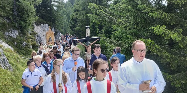 Una giornata iniziata con un cielo insolitamente nuvoloso, ma subito schiarito illuminando l’effigie di Maria, Madonna del Lussari in prossimità della grande scultura della Croce di Aquileia che sorge non lontano dai 1789 metri di quello che egli sloveni chiamano Svete Višarje e i carinziani, invece, Luschariberg. Quattro mitrie si avvicinano, quattro Vescovi per celebrare un pellegrinaggio nel luogo che storicamente (e soprattutto spiritualmente) unisce i tre grandi ceppi culturali dell’Europa. Nella mattina di sabato 21 giugno, in prossimità della Natività di San Giovanni Battista che tradizionalmente apre i pellegrinaggi estivi sul Lussari, quei quattro presuli, alcuni preti e un buon gruppo di pellegrini, alcuni dei quali saliti a piedi da fondovalle, celebrano così La Madonna dei tre popoli. Assieme all’ Arcivescovo di Udine, mons. Riccardo Lamba, i confratelli di Gorizia mons. Carlo Roberto Maria Redaelli, di Lubiana mons. Stanislav Zore e di Gurk-Klagenfurt mons. Josef Marketz. Presente anche il vicario generale di Capodistria, mons. Slavko Rebec.