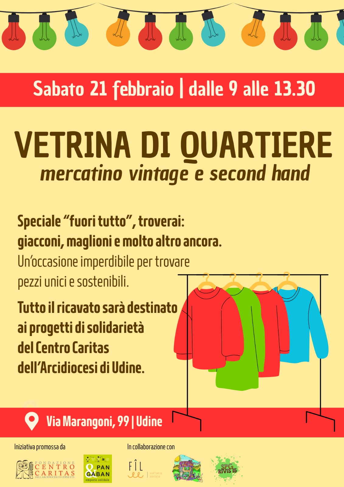 Torna “Vetrina di Quartiere”, l’amato mercatino vintage e second hand dell’emporio solidale “Pan&Gaban” della Caritas di Udine. L’appuntamento è per sabato 21 febbraio – dalle 9 alle 13.30, al civico 99 di via Marangoni – e nell’occasione si potranno trovare selezionati abiti usati, pezzi unici e originali, in particolare giacconi e maglioni. Il tutto a fronte di un’offerta libera, il ricavato sarà destinato alle diverse progettualità di solidarietà della Fondazione Centro Caritas di Udine. L’iniziativa è organizzata in collaborazione con lo Spazio Giovani Via Rivis 15, la sartoria sociale Fîl e la Casetta a colori (in caso di maltempo l’appuntamento sarà rinviato a data da destinarsi).