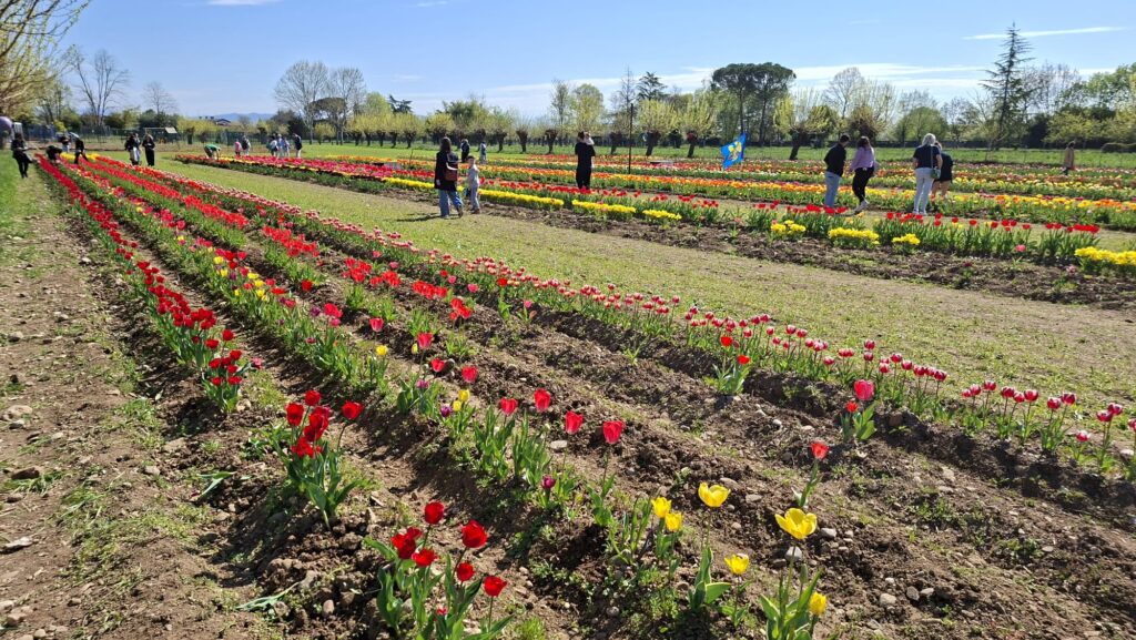 «Non vendiamo fiori recisi: vi lasciamo anche il bulbo, così potete piantarlo» spiega Angelo, il titolare, il secchio in una mano e la forca nell’altra. Con la moglie, le figlie e i nipoti, nel 2025 ha maturato l’intuizione di dedicare uno dei campi della famiglia alla coltivazione di tulipani. Manco a dirlo, è stato un successone. Quest’anno i filari sono aumentati, la realtà si è strutturata, c’è un profilo Instagram (curato da una delle figlie). E le auto in coda lungo la strada.