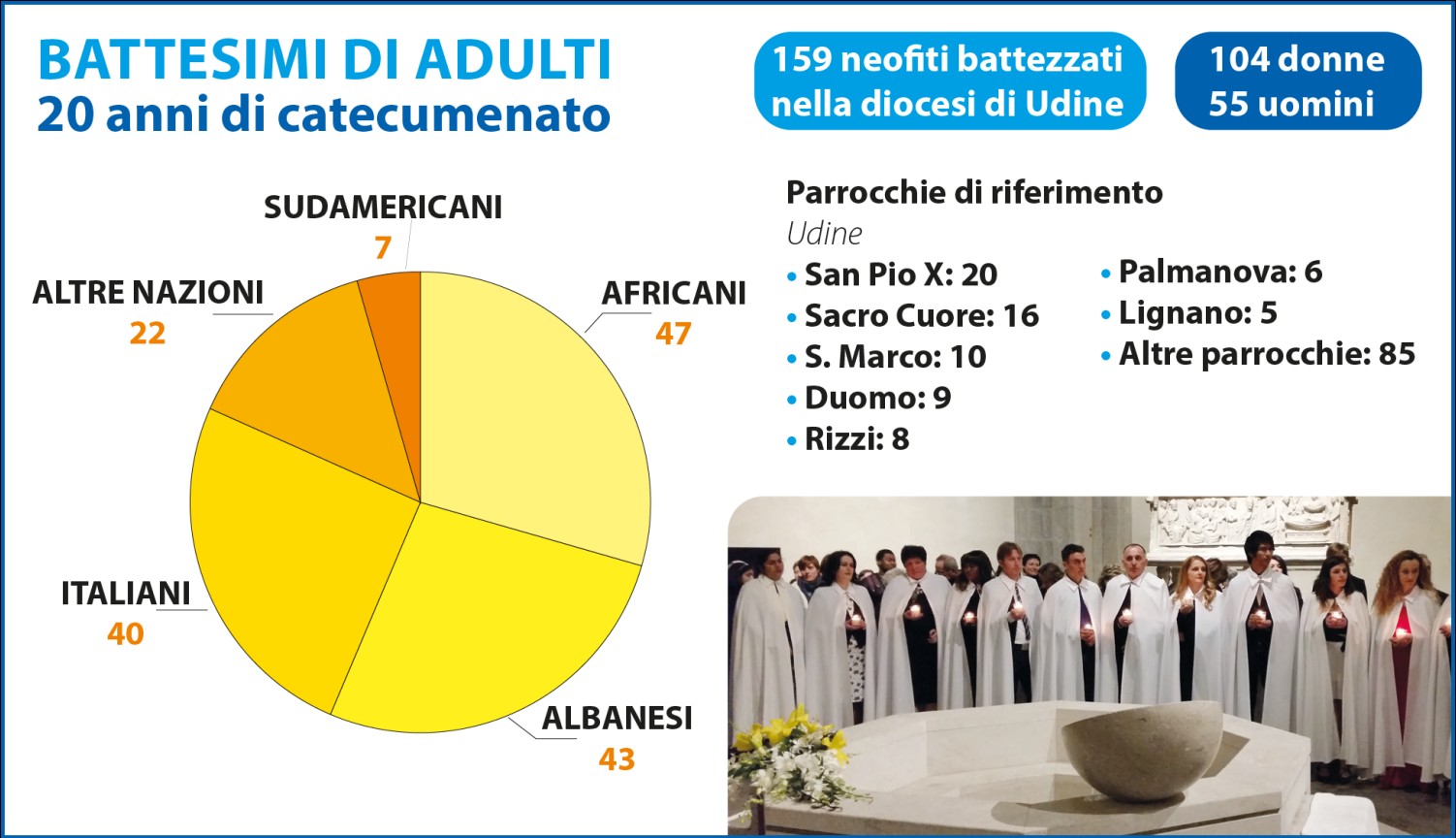 In vent’anni sono stati oltre 150 gli adulti battezzati in diocesi, per due terzi donne, dai 16 ai 62 anni. In principio si trattava quasi solo di italiani – precisano dal Servizio per il Catecumenato –, per diversi anni, poi, oltre la metà di coloro che ogni anno presentavano richiesta era albanese (43 in tutto i battezzati di questa nazionalità, 40 gli italiani). Si trattava perlopiù di persone già integrate, che magari dopo essersi “sistemate” anche economicamente, chiedevano di far parte della Chiesa Cattolica. Numerosi anche gli africani: ghanesi (17), ivoriani (10) e nigeriani (9), in particolare. Ultimamente le richieste arrivano più di frequente dall’Est Europa e pure da Paesi asiatici.